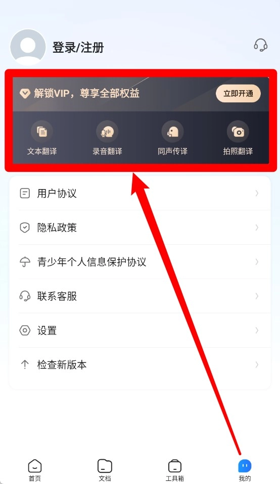 5、在“我的”页面,你能够查看会员翻译功能,还能进入设置界面以及联系客服等。