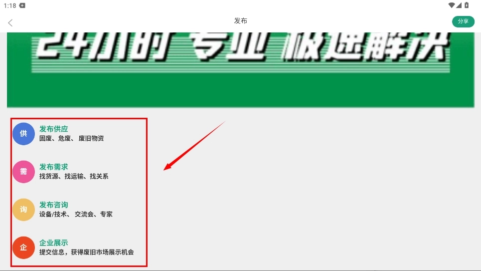 2、选择需要发布的物资类型,包括废金属、二手设备等不同分类选项。