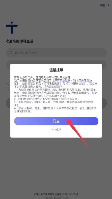 1、启动添可生活后,仔细阅读用户协议并点击"同意"按钮进入主界面。