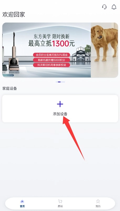 3、在首页找到"添加设备"功能入口,点击即可开始搜索添加就近的家电设备。