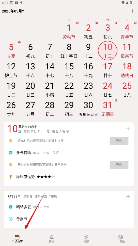 2、进入主界面后选择底部导航栏的生活日历选项,即可查看完整日期信息和实时天气状况。