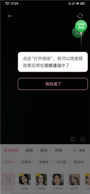 3、当进入设置界面后,在界面下方能看到美妆模板、美颜、美妆、滤镜等功能,借助这些功能,用户能够自主调整微信视频通话中的美颜效果。