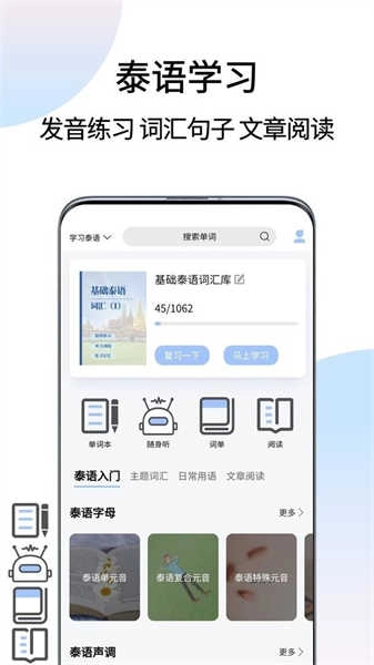 1. 泰语词汇学习课程:该课程包含泰语字母、基础词汇以及主题词汇,以有声形式呈现,通过系统化学习,能让学习效率更高。