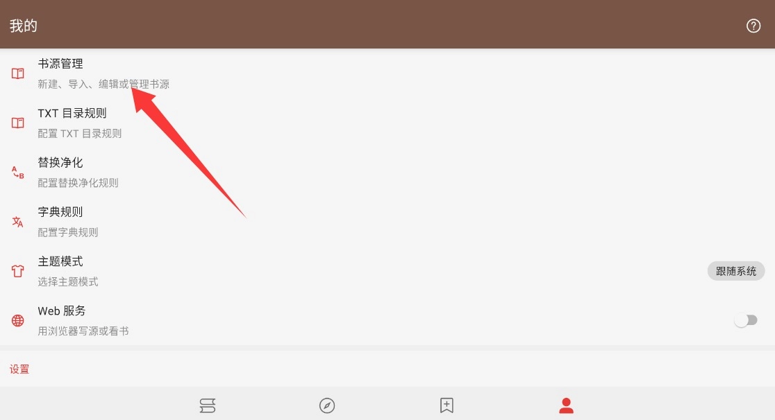 2、在底部导航栏切换至"我的"页面,找到并点击"书源管理"选项进入书源配置中心。