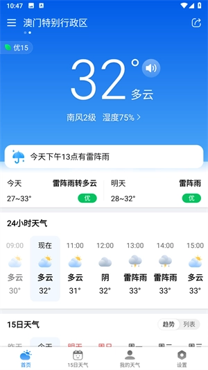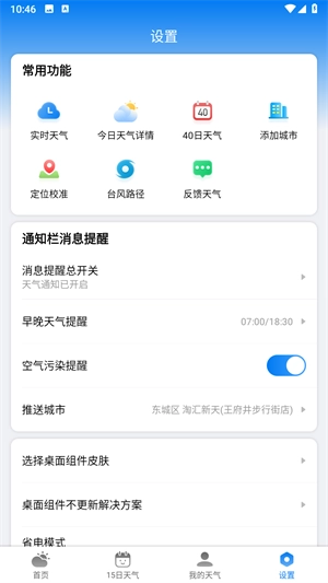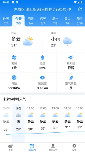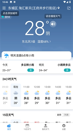 1、今明天气:清晰呈现今日与明日的天气状况,助您轻松了解未来两天天气的变化,以便为日常出行提前做好准备。