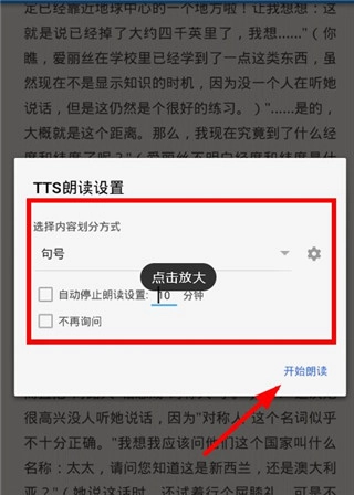 3、如此,用户仅需设置好朗读内容的划分方式、停止朗读的时间,再点击开始朗读按钮,就能朗读该书籍了。