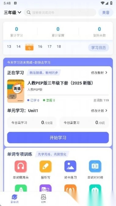 2.完成填写后,进入到软件的背单词页面中可以看到许多的学习功能