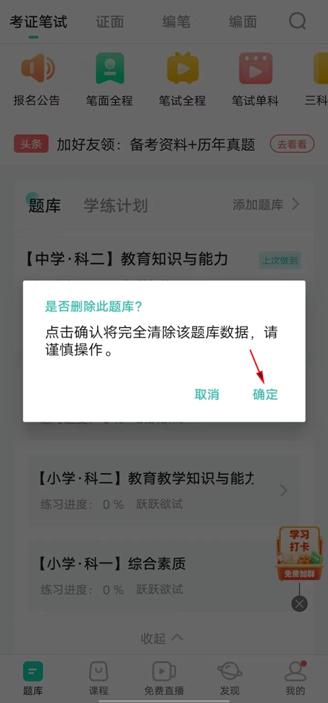 2、跳出弹窗是否删除此题库,点击确定。