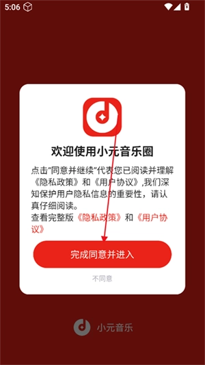 先安装小元音乐圈,安装完成后打开它。当出现“欢迎使用小元音乐圈”的提示界面时,点击“同意并进入”。