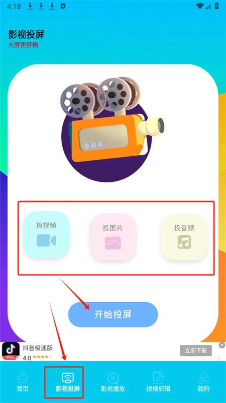2. 开启软件并进入主页,于影视投屏页面挑选投视频、图片等选项,接着点击“开始投屏”。