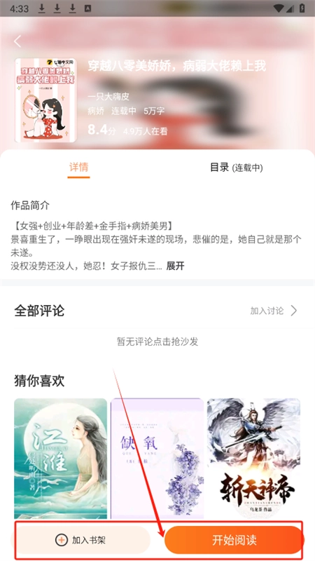 3、搜索成功后,进入详情页面,可以加入书架,也可以点击开始阅读