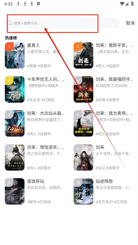 2、打开软件进入主页,可以点击上方搜索框,输入想要小说作品名称等关键词就能快速找到