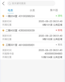 3、进入房源板块,查看各房间的到期时间,以及水表、电表的数量信息,并远程抄表。