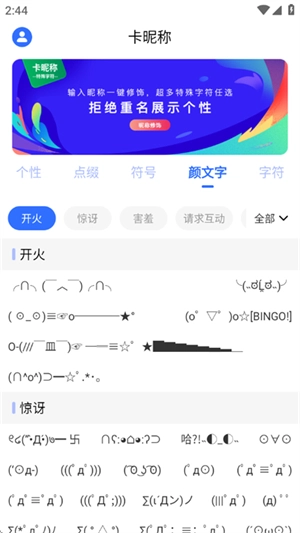 3、在应用里,您能够浏览到众多昵称字符、特殊字符、个性字符和表情字符。