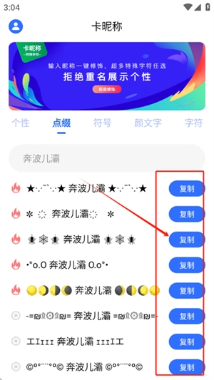 4、借助卡昵称的一键获取功能,您能够便捷获取特殊字体、花样字符等,进而生成独具个性的昵称。