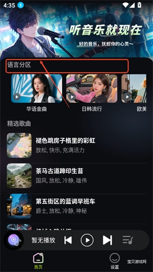 3、继续向下浏览,能看到语言分区,还有精选歌曲等内容。