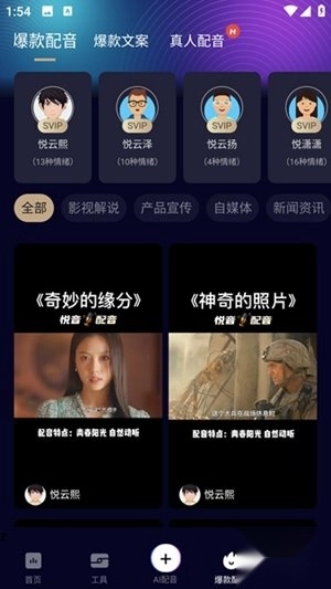 用过不少配音软件,这款真的让人眼前一亮,设计超棒,还有真人老师配音,抖音上好多热门声音在这儿都能找到。