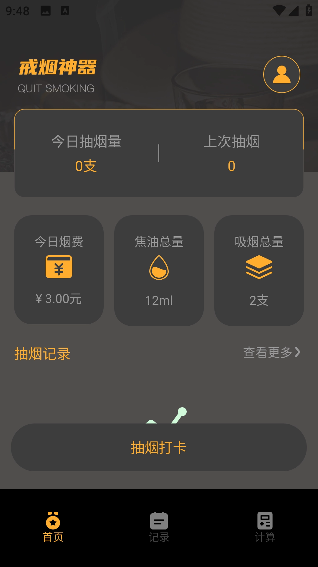 1、打开,首页会实时显示今日抽烟量、累计吸烟次数以及焦油摄入量;