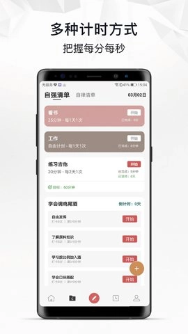 自律自强是一款日程管理软件,能有效助力用户合理规划每日及每周计划。借助其堆叠功能,可轻松将同类文件夹归拢在一起,帮助用户养成自律习惯,确保重要信息无一遗漏,还能实现快捷查找,大幅提升做事与办事效率。