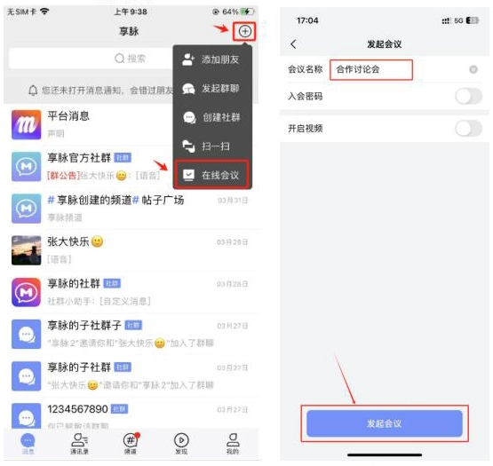 1. 点击右上角图标,接着点击在线会议,然后输入会议名称,无需设置入会密码,同时开启视频。