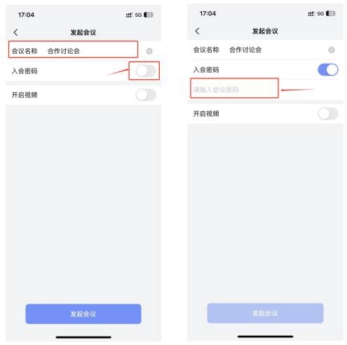 2. 首先要设置入会密码,找到入会密码右侧的图标并点击,使其处于开启状态,接着输入6位数字的入会密码,完成后点击发起会议。