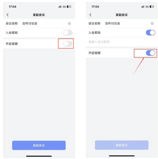 3、若要开启视频会议,点击开启视频右侧的图标以打开它,然后点击发起会议。