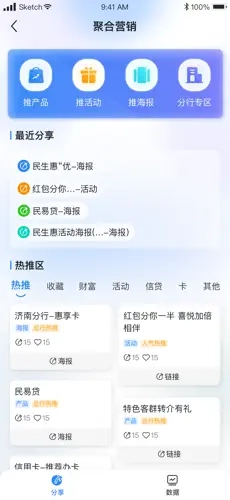 “民生E行”能够为用户供给聚合营销、产品货架、营销活动、推海报等移动化应用服务。