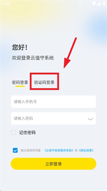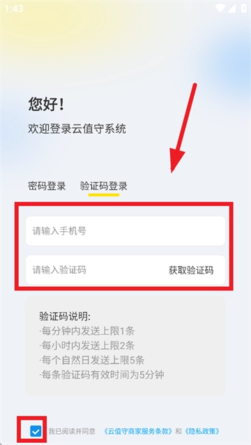 请输入手机号码、验证码,同时勾选“我已阅读并同意《云值守商家服务条款》以及《隐私政策》”,随后点击“立即登录”,便可完成操作。