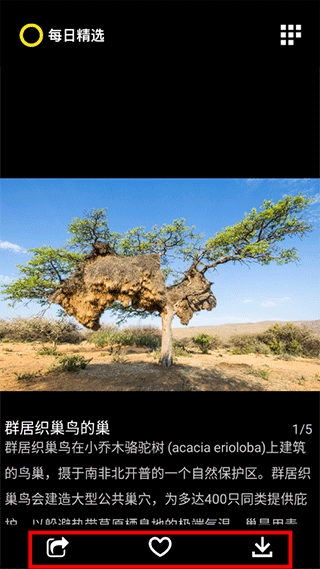 3、点击下图红色方框内的三个图标,按顺序能够分别对图片执行分享、收藏操作。