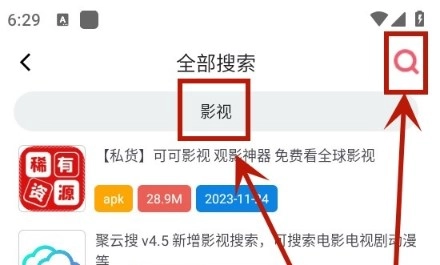 3.搜索框打出【影视】点击搜索符号