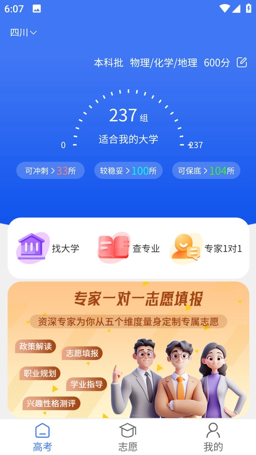 3、主界面设有找大学、查专业、专家1对1等功能,点击即可进入使用。