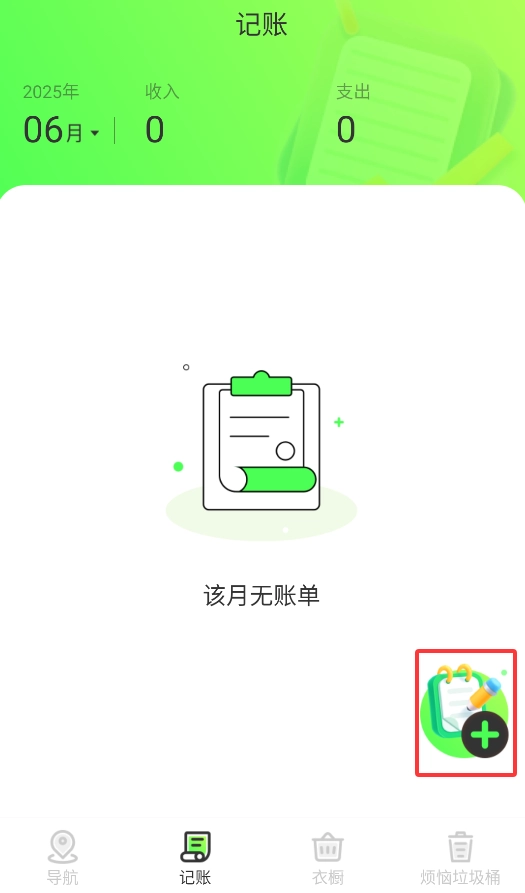 2、进入"旅行记账"模块,点击"+"记录每笔旅途开销,自动分类统计旅行支出。