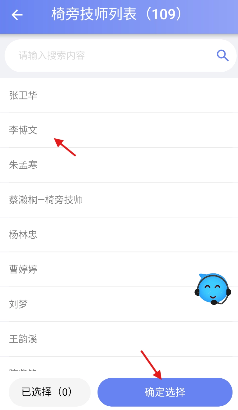 4、在技师列表中浏览选择所需技师,确认人选后点击 “确定选择” 完成绑定流程。