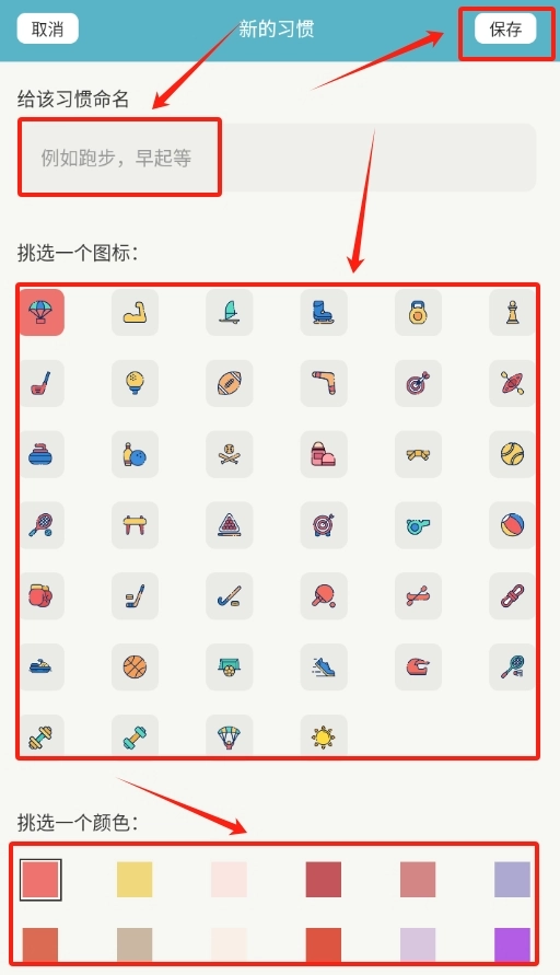 3、接着输入习惯名称,挑选喜欢的图标和颜色,点右上角 “保存” 就完成了。