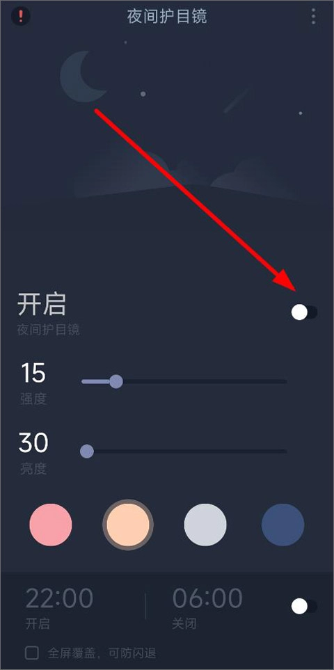 1. 打开夜间护目镜的操作如下:进入主页后,点击主页右侧的开启按钮,就能开启夜间护目镜。此外,还能够对其强度、亮度,以及开启和关闭时间进行调节。