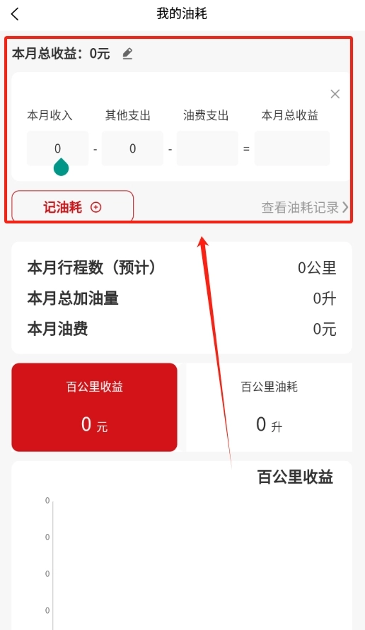 3、登录后,再在我的页面点击我的油耗,可以记录除去其他支出和油费支出的本月总收益。