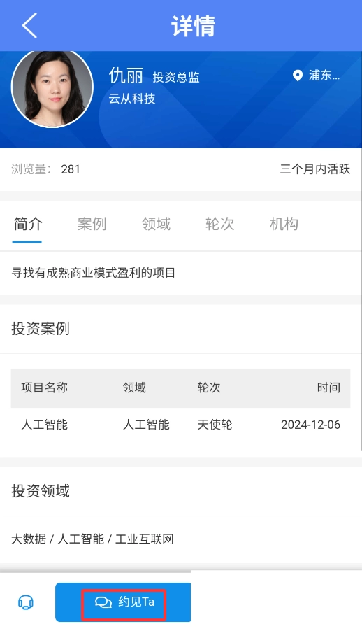 3、选定目标投资人后,可使用"约见"功能直接发起会面申请,建立深度合作机会。