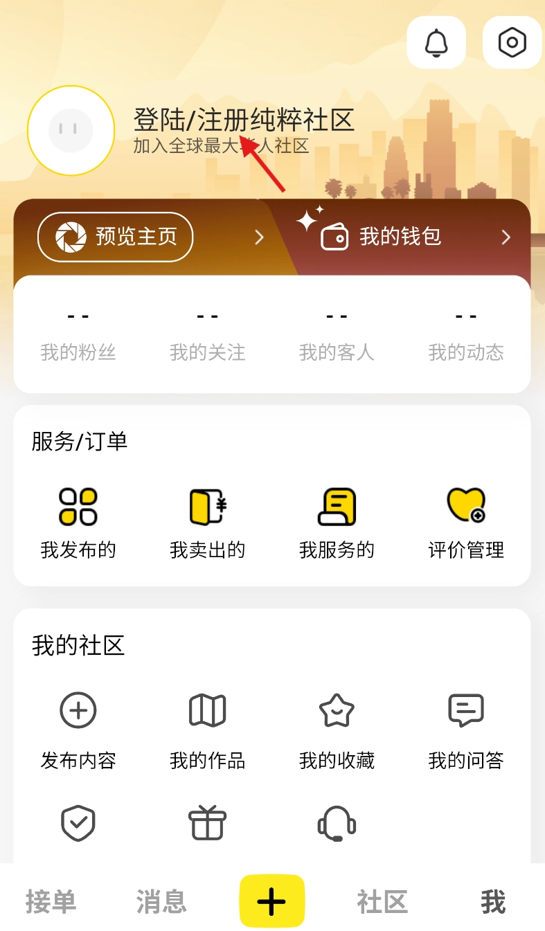 2、在“我”页面内,寻找到显眼的“登陆 / 注册纯粹社区”选项,点击该选项进入注册流程界面。