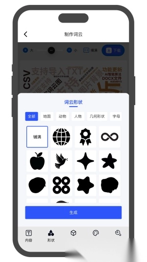 3.支持预设形状、自定义形状、个性布局、字体颜色、词汇间距、旋转角度等参数设置
