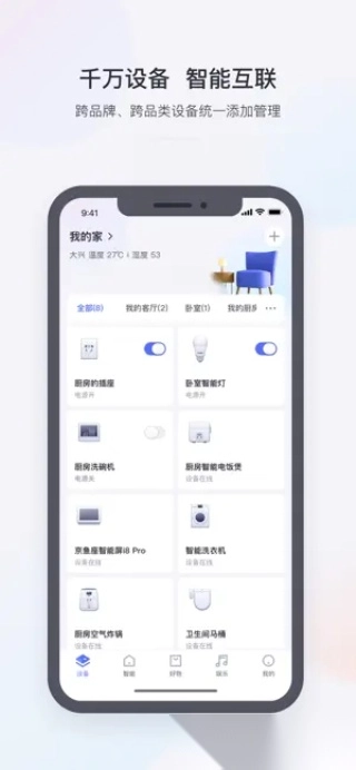 小京鱼是一款生活服务软件,能助力用户一键式智能管理家中各类家居设备,可安装在安卓手机上使用。这款软件贴心地配备了语音指令功能,当用户忙碌时,只需直接说出指令,就能操控家中各种设备,轻松改变其运行状态,极为便捷。