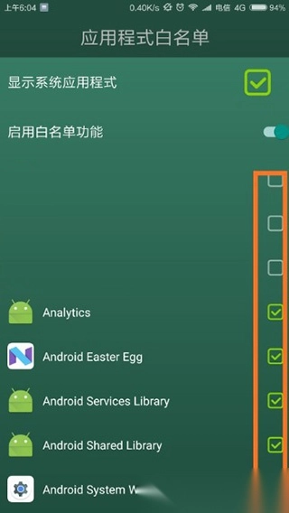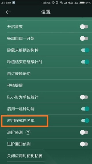 4. 当成功进入“应用程式白名单”界面后,便能够对所有应用进行设置。其中,打钩的应用属于白名单,运行这些应用不会导致树枯萎;反之,若运行未勾选的应用,树就会枯萎。