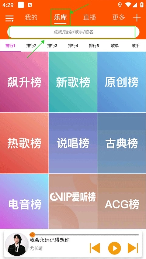 1、打开之后,第一步是在乐库中挑选你喜爱的歌曲,当然你也能够直接在搜索框内搜索歌曲的名称。