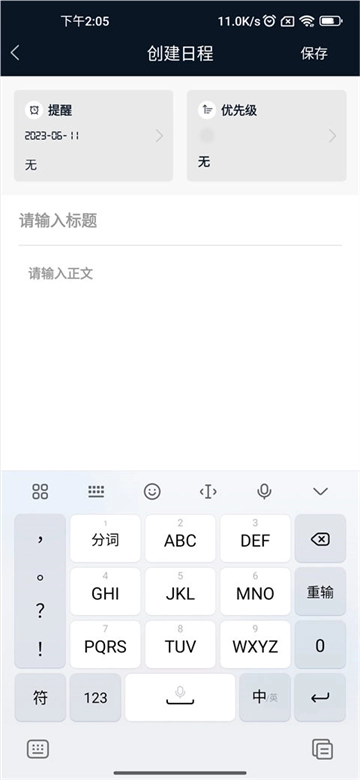 3、接下来就能创建日程,填入标题与正文,同时设定提醒时间及优先级,最后点击保存就行。