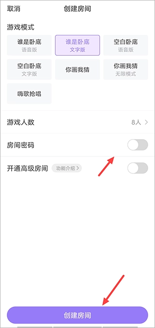 3、选择好房间类型后,再选择游戏模式,人数、密码后,点击创建房间即可。