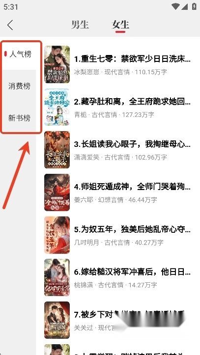 用户们也可以根据小说排行来挑选小说,有人气榜,消费榜和新书榜