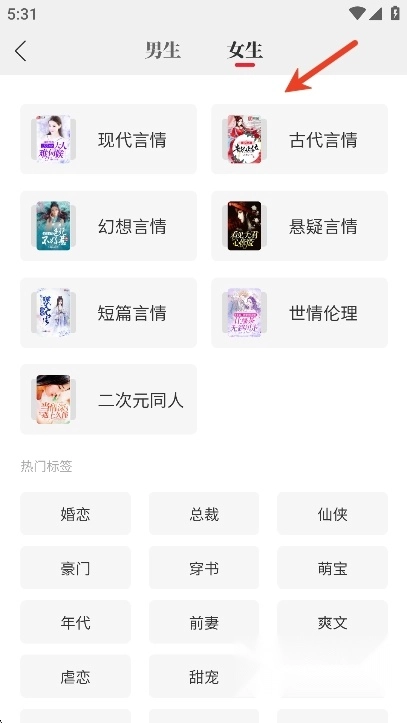 用户们也可以根据小说分类筛选出自己喜欢类型的小说,例如现代言情,幻想言情,二次元同人