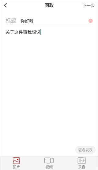 2. 当进入问政界面,完成标题与内容的填写,并上传图片,接着点击下一步验证信息,随后就能进行发布操作。
