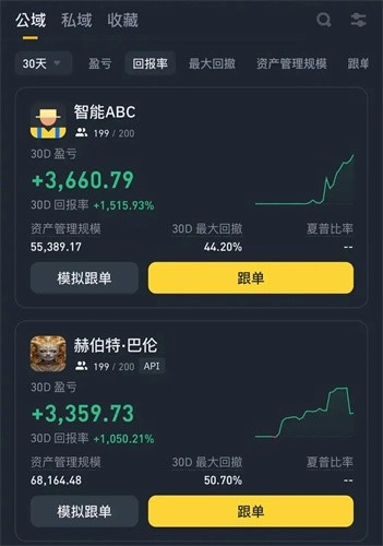 1、若要开启跟单交易,需找到「合约」>「跟单」,在此处能够看到各位带单员,以及他们诸如收益率、盈亏、夏普比率等交易数据。