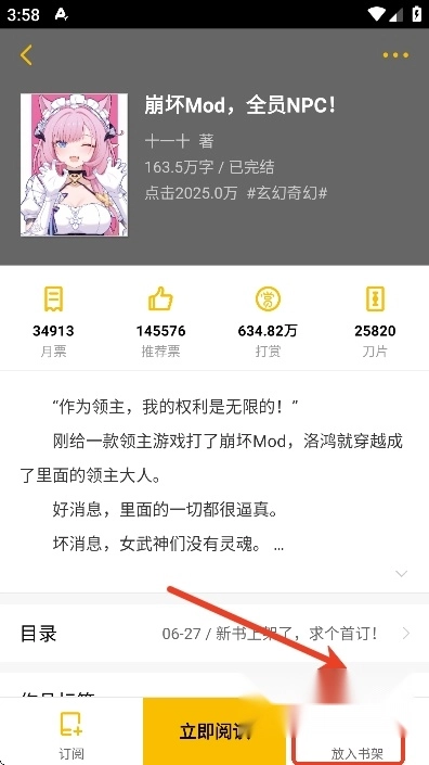 用户们挑选完小说后,可以点击“加入书架”,将喜欢的小说收藏到书架