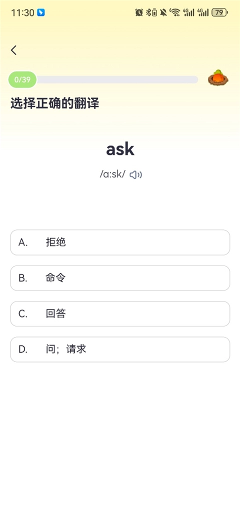 3、进入章节后,你能够挑选不同的词语展开学习,还能进行单词播放与翻译操作。